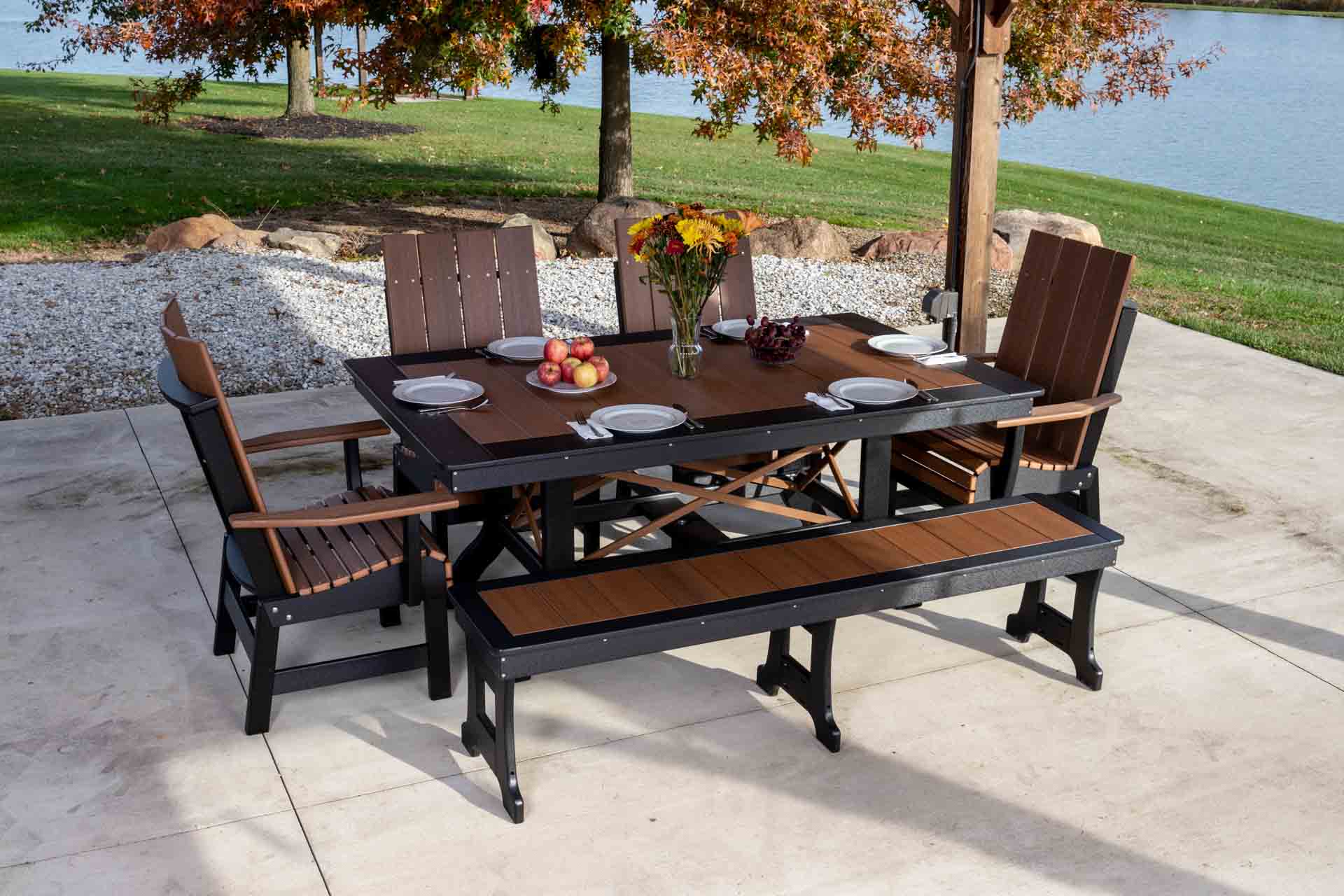 Sunset Furniture presents a sophisticated 6-piece outdoor patio furniture dining set, meticulously crafted from durable poly-lumber by skilled Amish craftsmen in Ohio. The ensemble boasts two stylish Contemporary Arm Chairs, two Contemporary Side Chairs, and a Bench, all designed for maximum comfort and aesthetic appeal. The centerpiece is a 44″ x 72″ Dining Table with a captivating border, creating an inviting space for outdoor dining and gatherings.